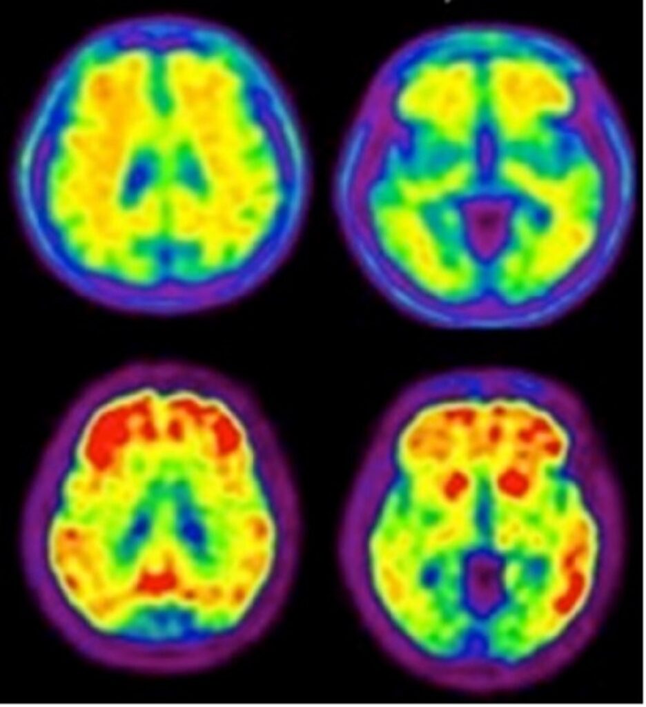 Figure 1: Same patient comparison of an FDA-approved 18F-Aβ tracer (top row) to 18F-NAV4694 (bottom row) (Krishnadas 2021).