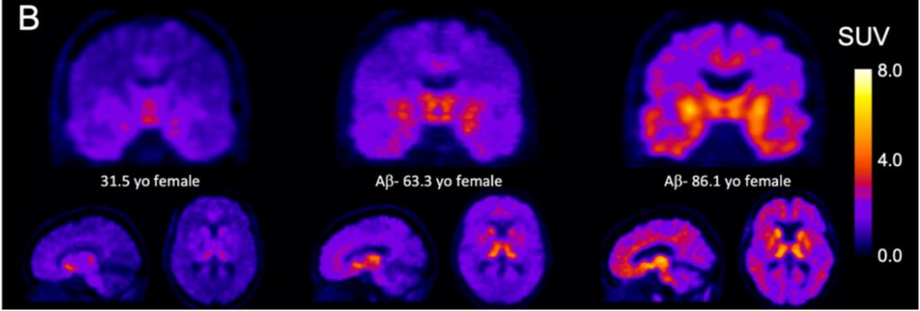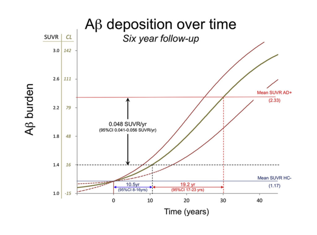 - Researchers have found that PiB-PET scans can detect abnormal levels of beta-amyloid (Aβ) in the brain 15 years before the typical levels of amyloid are reached in patients with Alzheimer’s disease dementia. The total accumulation time for Aβ from zero to typical amounts found in people with Alzheimer’s disease occurs over 25–30 years.
