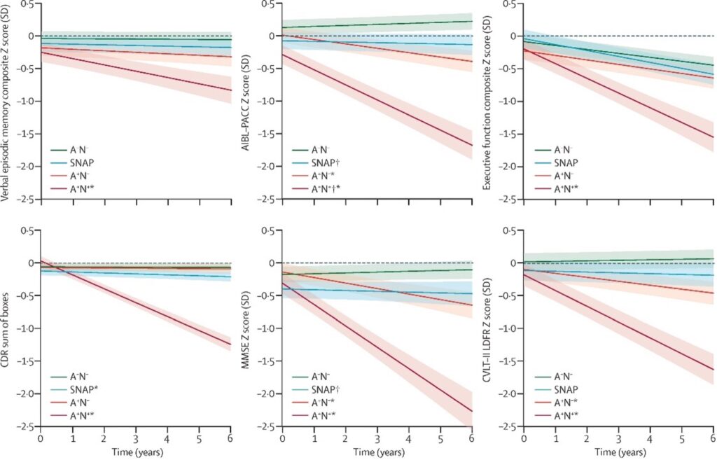 Figure 6: Cognitive trajectories of cognitively unimpaired individuals without Ab and neurodegeneration (green), without Ab and with neurodegeneration (blue), with Ab and without neurodegeneration (orange) and with Ab and neurodegeneration (red).